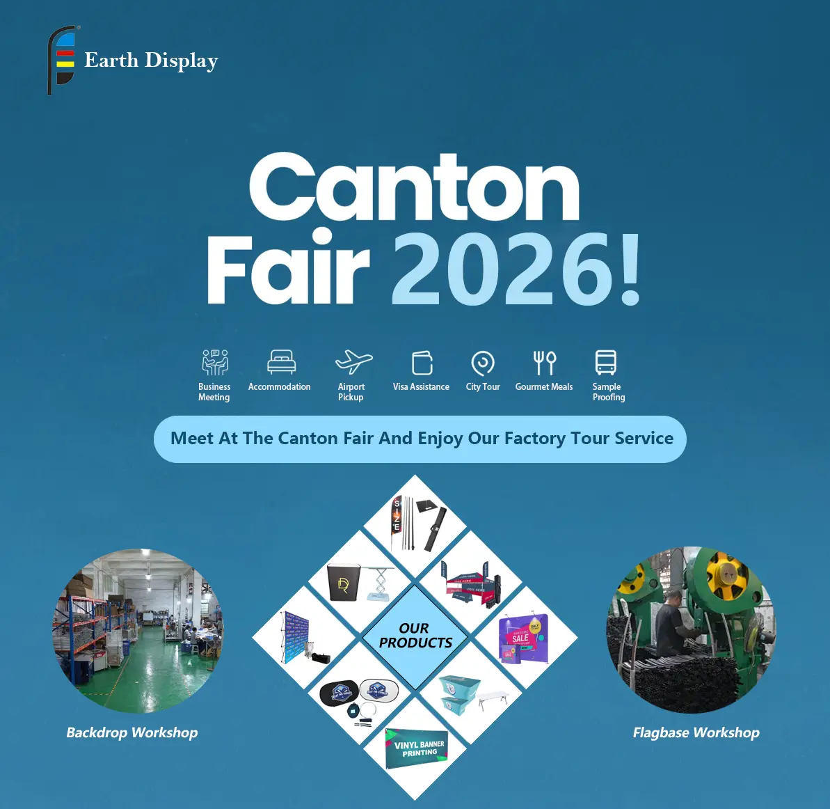 2026 Kanton Sərgisi yaxınlaşır və biz Earth Display-də sizi orada görməyə ümid edirik. Artıq on ildən çoxdur ki, biz lələk bayraqları, pop-up fonları, bayraq altlıqları, xüsusi vinil bannerlər - əsasən sərgilər və reklamlar üçün hər şey hazırlayırıq. Bu dəfə sadəcə onlayn danışmaq əvəzinə üzbəüz nə etdiyimizi sizə göstərmək istəyirik.